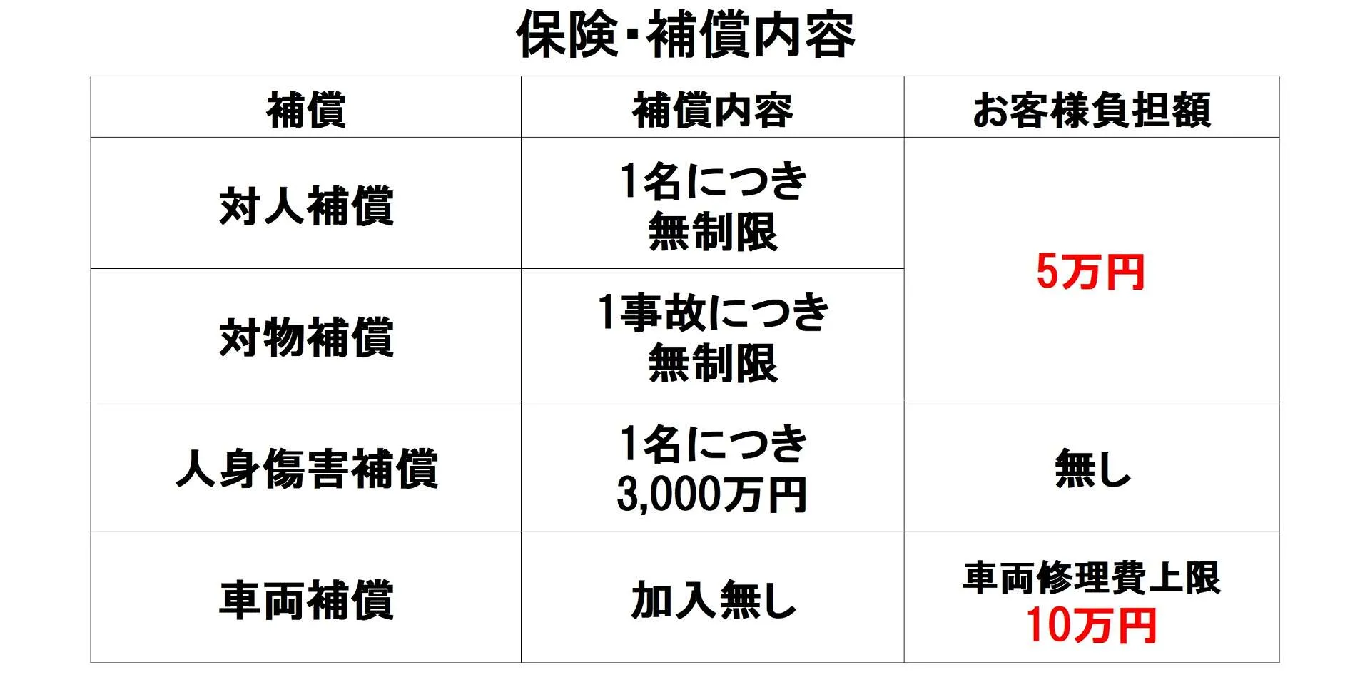 レンタカーの車両には自動車保険(対人賠償・対物賠償・人身傷害)が付帯されています。